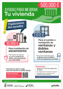 Está abierto el plazo de solicitud de ayudas para la instalación de ascensores y el cambio de ventanas que ha puesto en marcha el Ayuntamiento de Getafe, a través de la Empresa Municipal de Suelo y la Vivienda (EMSV) hasta el 29 de Septiembre. El objetivo es hacer las viviendas más accesibles, mejorando la climatización de la vivienda y el ahorro de energía.