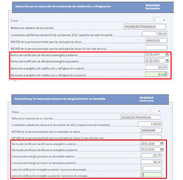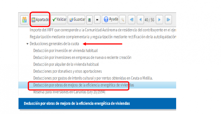 Dentro de ese apartado se debe seleccionar la deducción a aplicar, y recordar que son incompatibles entre sí. En el apartado destinado a cada deducción, se han incluido las casillas necesarias para incorporar la información de los certificados de la vivienda expedidos por el técnico competente antes y después de la realización de las obras.