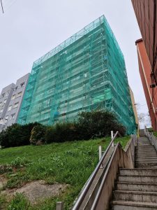 La obra consiste en la rehabilitación de fachadas con el sistema SATE. Es un Sistema de Aislamiento Térmico por el Exterior que consiste en colocar el aislamiento térmico en las paredes exteriores de un edificio a través de diversos elementos. Esta técnica mejora el rendimiento térmico general del edificio y, por lo tanto, permite un ahorro sustancial de energía.