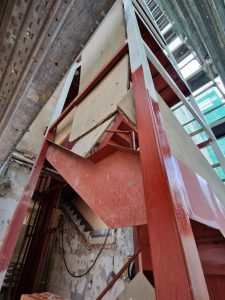 La estructura se ha finalizado completamente tanto del casetón por el que va a transcurrir el ascensor con su cerramiento, como de la escalera que irá por el exterior.